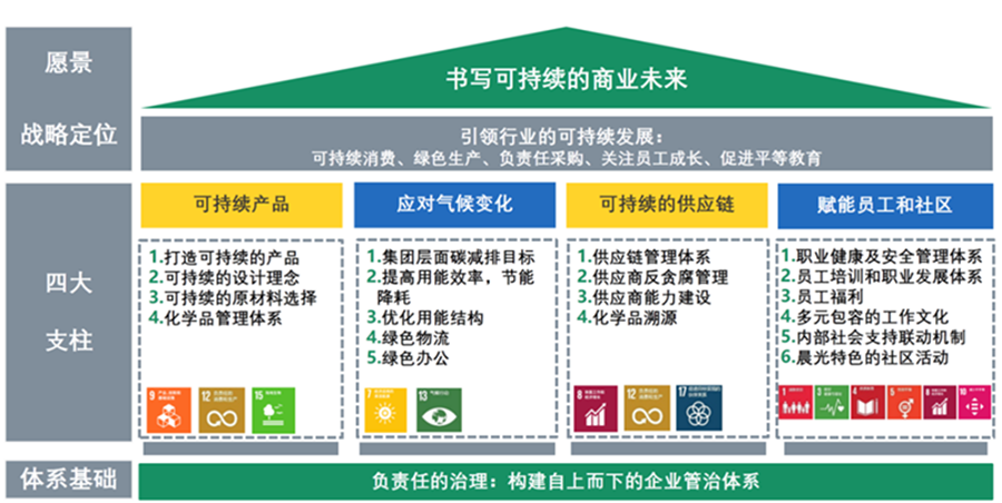 在“以消費者為中心”的價值觀指引下,晨光制定了2022-2025年可持續發展戰略,以"書寫可持續的商業未來"為可持續發展愿景,圍繞"可持續產品、應對氣候變化、可持續的供應鏈、賦能員工和社區"四大支柱,引領行業的可持續發展。