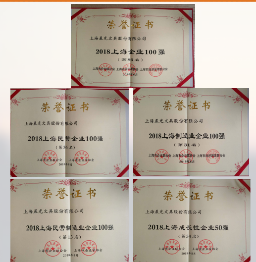 (晨光文具2018年上海企業(yè)100強榜單榮譽證書)