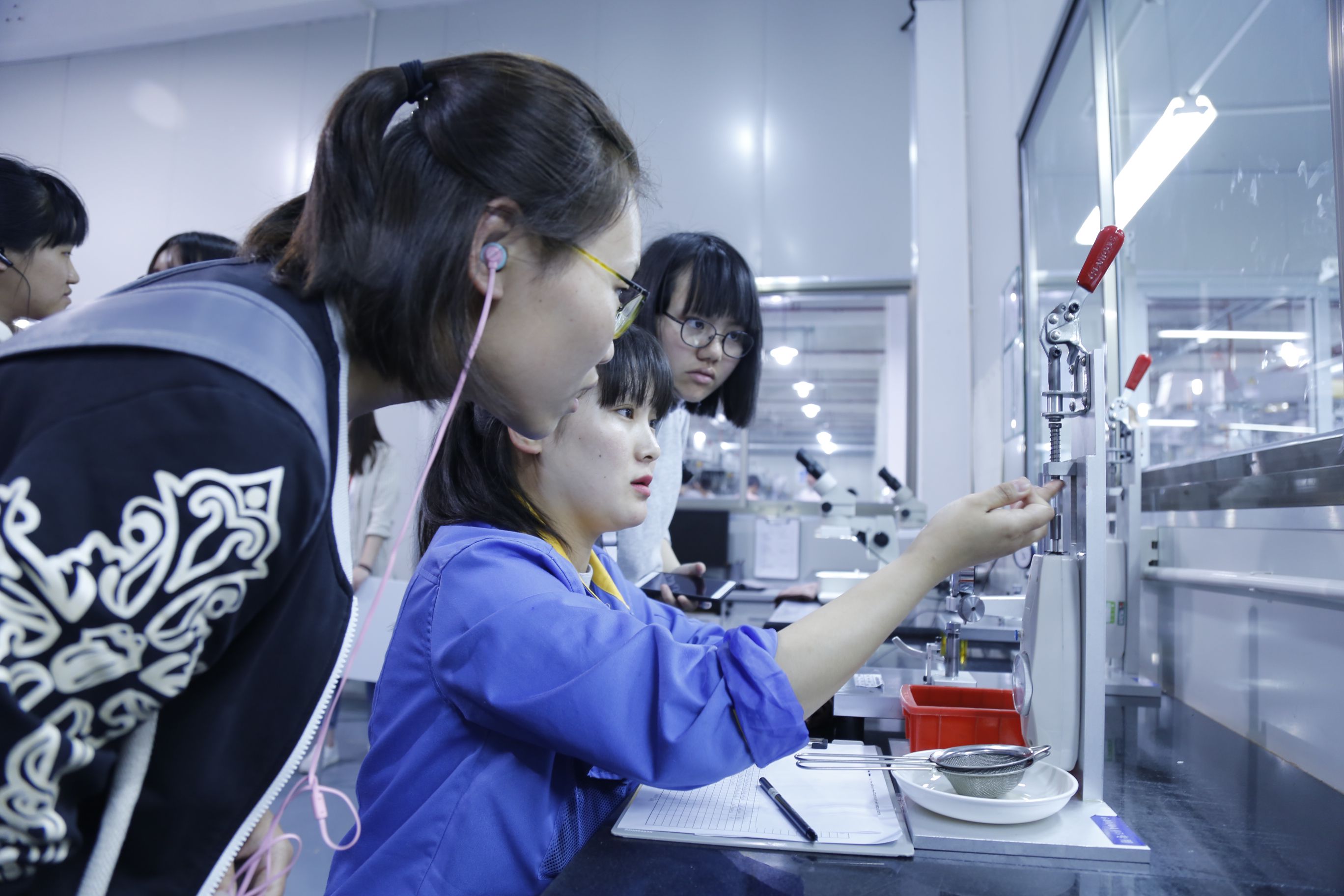 圖為同學們參觀筆頭廠觀察筆頭檢測過程