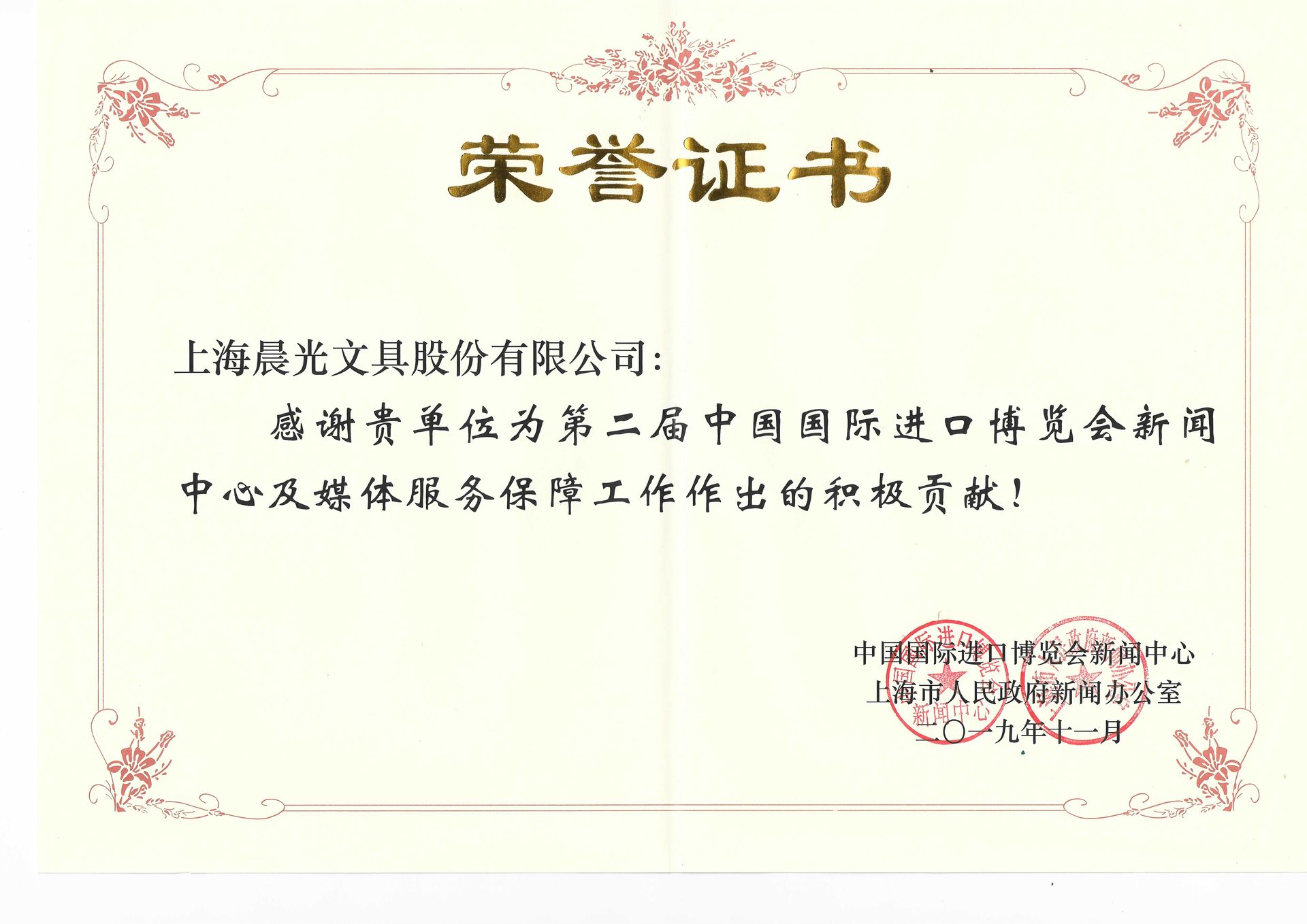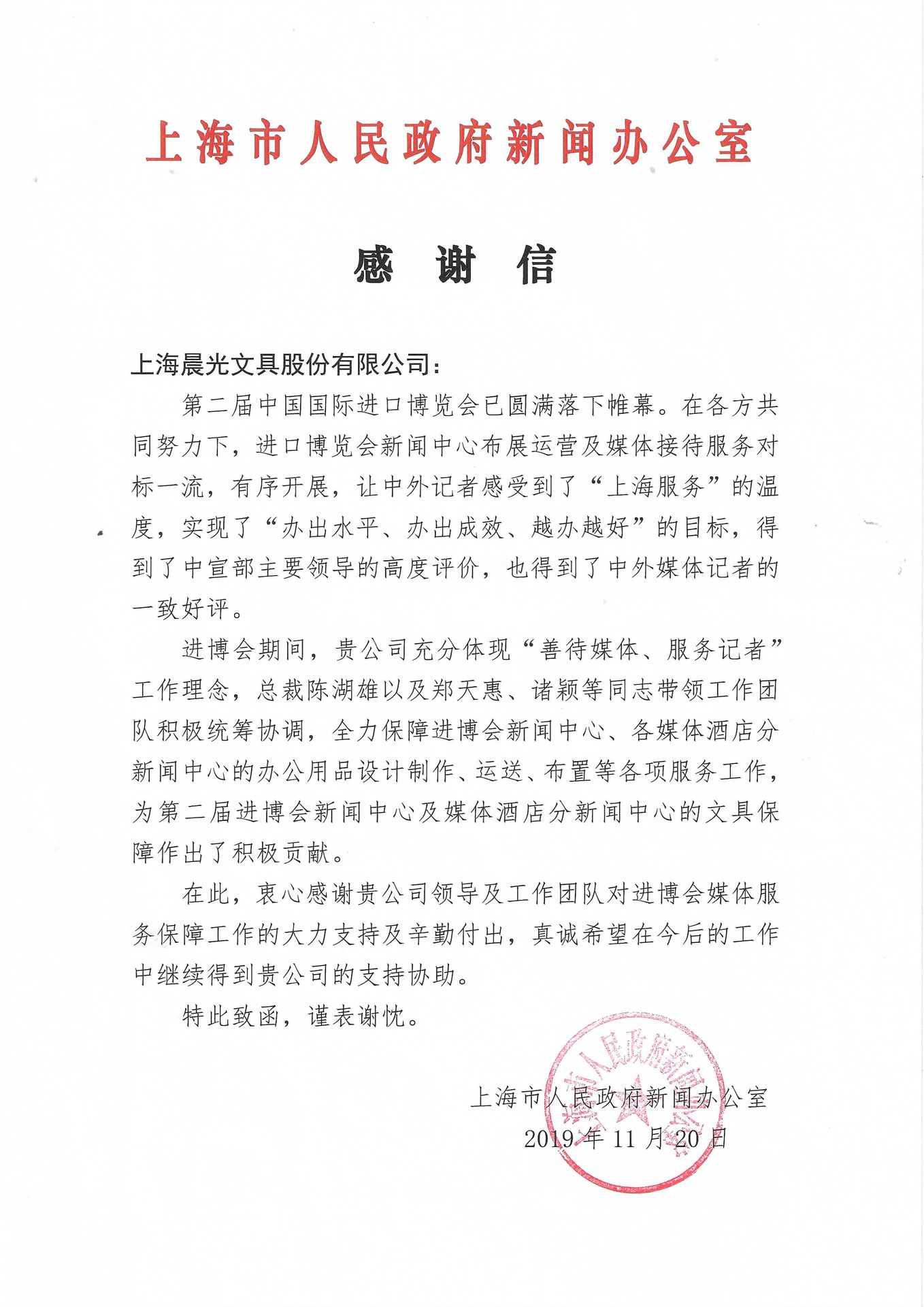 近日,我司收到了一封來自上海市人民政府新聞辦公室的感謝信,感謝晨光文具為第二屆中國國際進口博覽會新聞中心及媒體服務保障工作作出的積極貢獻。12月4日,第二屆進博新聞中心總結大會上,上海市人民政府新聞辦公室向晨光文具及其他助力企業頒發了榮譽證書。